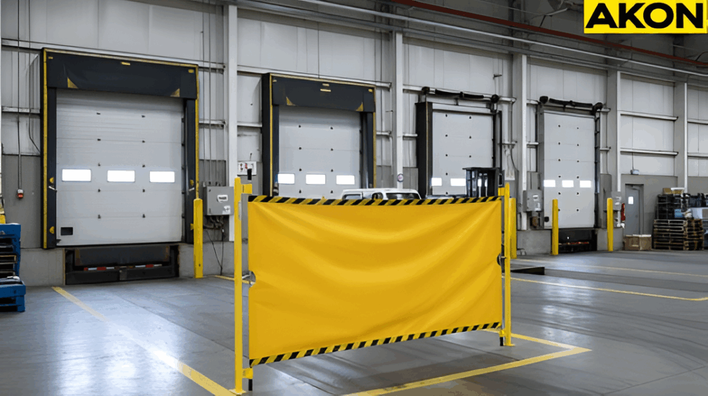 Retractable barriers create a physical stop point at open dock doors that limits unintended access to hazardous edges.